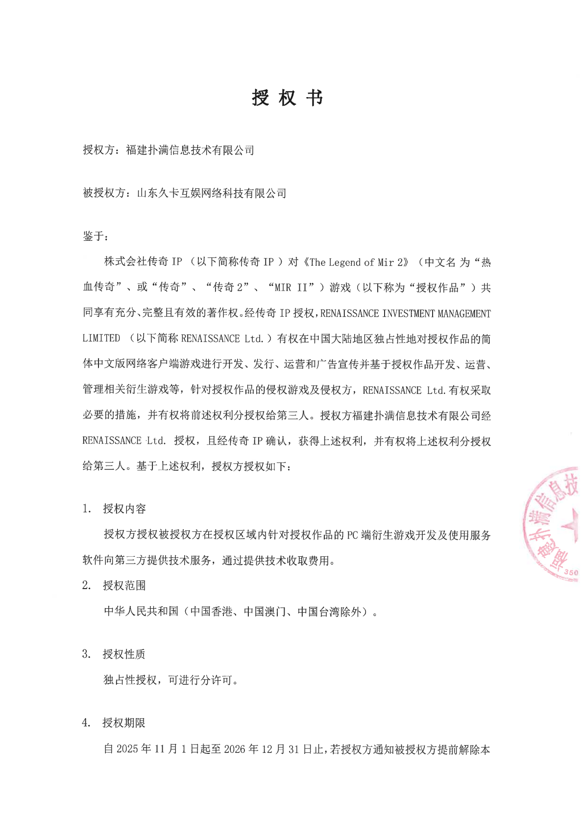 关于山东久卡互娱网络科技有限公司的独占性授权公示